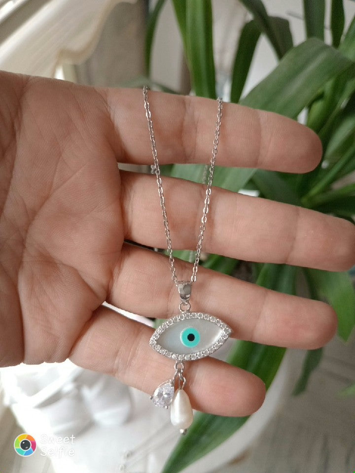 Göz Desenli İnci Sallantılı Gümüş Kolye